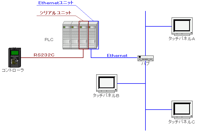 端末を制御するコントローラと、それらの設定及び監視を行うタッチパネルで構成されているシステムがありました。
