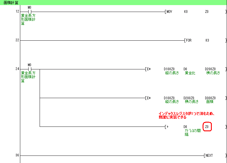 面積計算の処理のはじめに直接常時ON(SM400)を記述せず、間にM0を絡ませています。これにより、検索、変更がしやすくなります。