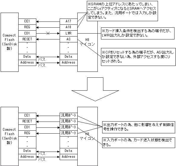 CE1を単純に汎用ポートで制御するようにした場合には、CF制御中の割り込み、タスクディスパッチ時には必ずチップセレクトをインアクティブにする必要があります。