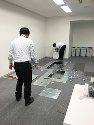 転勤してきた当初は、長方形の1フロアで入り口前に棚を置いて、入り口とそれ以外のエリアというように簡単にフロアを分けていました。打ち合わせができるような仕切りのある会議室がなかったので、パーテーションで仕切りを作ることになりました。会議室設置の作業は、まずは、会議室をどのくらいの広さにするか上司と相談するところから始まりました。会議室のことだけでなく、社員用の机が増える場合どうするかというところまで検討を重ねて、位置や広さを調整しました。その後、業者を決めて工事という流れで進みました。ビル管理会社との打ち合わせや床下を開けて配線の見直しなど工事前に実施しておくことがあり、慣れない作業で苦労しましたが、良い経験ができました。